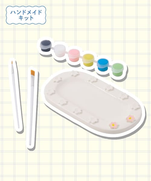 ●おうちでの一人時間にもぴったりのペイントトレーセットです。●6色の絵の具付きで、オリジナルのトレーが作成できます。●完成後はアクセサリーなどの小物を置いても◎■仕様■セット内容:トレー1枚、筆2本、絵の具6色使用不可:オーブン、食器洗浄機《ご使用方法》1.付属の絵の具と筆を使って色を塗ります。※着色の際はトレーの下に新聞紙などを敷き、テーブルに色移りしないよう注意ください。※付属の絵の具以外をご使用にならないでください。※絵の具は水でうすめず、原液のままご使用ください。2.塗り終わったらそのまま約20分ほど乾かします。※絵の具の塗り方、季節によって乾燥時間が変わります。※完全に乾いてからご使用ください。《ご使用上の注意》●本品はインテリア用です。トレーに食品は載せないでください。●テーブルの上で引きずらないでください。●安定した平らな場所に置いてご使用ください。●ヒビ・カケ・傷のついた製品は思わぬ時に破損し、ケガをする恐れがございますので使用しないでください。●陶器は割れ物です。落としたり、硬いものにぶつける等、衝撃を与えると破損してケガをする場合があります。お取り扱いにはご注意ください。●サイズ・デザインが多少異なる場合があります。予めご了承ください。●オーブン・食器洗浄機のご使用はできません。●絵の具から独特のにおいがする場合がありますが品質には問題ありません。●色落ちする可能性があるので、絵の具で塗ったあとのトレーを水で濡らさないでください。●色を塗った部分は、ご使用を繰り返すことで徐々に色が薄くなったり剥がれることがあります。●使用後は必ず絵の具のキャップを閉めて保管してください。●使用後は絵の具が乾く前に筆を洗ってください。乾いた場合は、お湯につけ柔らかくして洗ってください。●乳幼児の手の届かない場所で使用、保管してください。●商品開封は保護者の方が行ってください。●お子様がご使用の際は、監督者が付き添い、十分に注意しながらお使いください。●本品は室内用です。屋外でのご使用はお避けください。●絵の具をなめたり、口に入れたりしないでください。●変形、破損した場合はすぐに使用をおやめください。●衣類などに絵の具が付着すると落ちにくいので、ご注意ください。●着色後は、よく乾燥させてください。●火気に近づけないでください。●直射日光は避けて使用・保管してください。●本来の用途以外でのご使用はおやめください。誤った使用による事故については弊社では一切責任を負いかねますのでご了承ください。●廃棄の際は、各自治体の廃棄区分に従ってください。