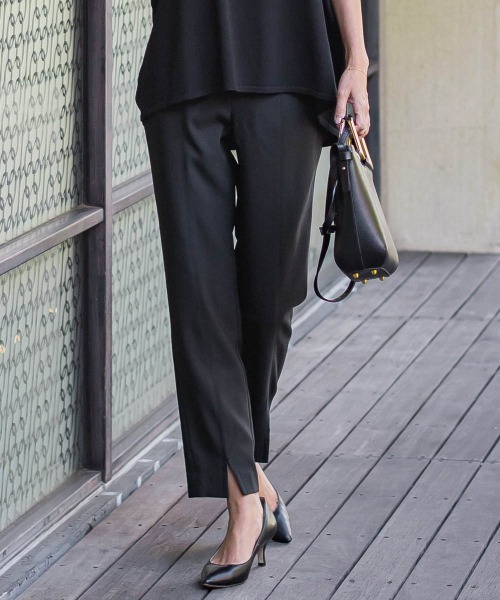 【デザインの特徴】 デニムのような表情をもつ薄手素材を使用した、軽やかなテーパードパンツ。 見た目はカジュアルながら、落ち感のある風合いで上品さも兼ね備えています。 薄手ながらストレッチ性があり、動きやすく快適なはき心地。 フロントに入れたスリットが足元に抜け感を与え、脚をすっきりと美しく見せてくれます。 腰まわりは程よくフィットしつつ、裾に向かって細くなるテーパードシルエットで、チュニックやシャツともバランスよく合わせやすい一本です。 【機能性】 ◆Easy Care ご自宅でのお手入れが簡単 ◆ストレッチ ◆抗ピリング 【素材の特徴】 ポリエステル100%でありながらまるでデニムのようなルックスが特徴の素材です。 程よいハリ感とドライタッチな風合いで快適なストレッチ性も備えています。 デニム素材のデメリットがなくイージーケア性に優れキレイ目に着用していただける素材感となっております。 ---------------------------------------------------------------- 洗濯方法 家庭洗濯:液温は40℃を限度とし、洗濯機で弱い洗濯ができる。 自然乾燥:日陰の吊り干しがよい。 アイロン:底面温度160℃を限度としてアイロン仕上げができる。 ドライクリーニング:石油系溶剤による弱いドライクリーニングができる。 ---------------------------------------------------------------- ■モデル身長 164cm/着用サイズ M ※画像の商品はサンプルとなりますので実際の商品と仕様、加工、サイズが若干異なる場合がございます。 ※お客様のモニター環境により実際のお色と多少異なる場合がございます。 ※撮影状況や光の当たり具合により、色合いが異なって見える場合がございます。 ※商品タグに記載されたサイズはヌードサイズです。実際の商品のサイズは商品情報の実寸をご確認ください。 --------------------------------------------------------------------▼商品のお気に入り登録 ハートマークをクリックし、お好きなカラーを選んでお気に入りに登録 完売カラーの再入荷通知や、ラスト1点の通知、セールの通知も受け取ることができます。 ▼ブランドのお気に入り登録 新商品や再入荷等、いち早くブランドのお得な情報を受け取ることができます。 --------------------------------------------------------------------