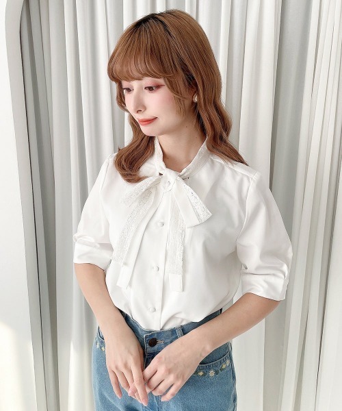 ■デザインポイント フロントのボウタイがレトロな印象のブラウス。 ボウタイは存在感のあるレースをレイヤードしたようなデザインになっており、タブを留めるだけで簡単に可愛いリボンが作れるのが嬉しいポイント。 いつもとは違う特別感のあるレイヤードリボンと、レースをあしらったスタンドカラーが上品な雰囲気とレトロさを漂わせてくれます♪ ■オススメスタイリング ミニスカートと合わせたトレンドライクなスタイリングや、ジャンスカやセットアップのインナーとして、たっぷりと着回しをお楽しみいただけます♡ ガーリーなデザインながらも、クラシカル、プレッピー、カジュアルなどの幅広いテイストのアイテムと相性が良いので、一枚持っておくとトップスに困らない一品です。 ====== 透け感:ややあり 裏地:なし 生地感:ふつう ====== ※アイロンは当て布を使用してください。 当商品をご使用いただく際やお洗濯の際は、商品に付属の品質表示およびアテンションタグを必ずご確認ください。 適切なお取り扱いにより、より長く快適にご着用いただけます。 スペアボタンは紛失時にご使用いただけるよう、大切に保管ください。 商品によっては、生地加工の薬品または染料の匂いが残っている場合がございますが、風通しのよい場所で陰干しいただくと緩和いたします。 ▼Fint/フィント 50~70年代のクラシカルなヴィンテージデザインに トレンド感をプラスしたレトロ&ガーリースタイルをお届け。 古着屋で一点ものを見つけるような【ときめき】を感じられるブランドです。 ▼商品のお気に入り登録▼気になるアイテムの♡をクリックしてお気に入り登録すると残り1点の通知、完売カラーアイテム再入荷の通知、お得な通知が届きます。 ▼ショップお気に入り登録▼ ショップからの新作商品やお得なイベント情報など、いち早くブランドからの情報を受け取ることができます。