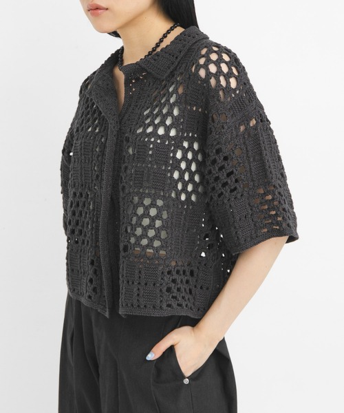【抜け感のあるスタイリングが叶うクロシェニットシャツ】 甘くなりがちなクロシェ編みを、ボックスパターン仕様にすることで大人っぽさを実現したシャツ風ニット。凹凸のある編地は存在感があり、身体のラインを拾い過ぎないサイジングは抜け感を叶えます。カジュアルボトムから女性らしいスカートまで幅広く合わせていただけます。 【2026 Spring/Summer】【26SS】 ※素材や編み方の性質上、引っ掛け、引っ掛かりが起きやすい性質をもっています。お取り扱いにはご注意ください。 総重量 : 約295g ※商品画像は、光の当たり具合やパソコンなどの閲覧環境により、実際の色味と異なって見える場合がございます。予めご了承ください。 ※商品の色味の目安は、商品単体の画像をご参照ください。 ▼お気に入り登録のおすすめ▼ お気に入り登録された商品は、マイページにて現在の価格情報や在庫状況の確認が可能です。 お買い物リストの管理にぜひご利用ください。 素材感 透け感 : あり 伸縮性 : あり 裏地 : なし 光沢 : なし ポケット : なし