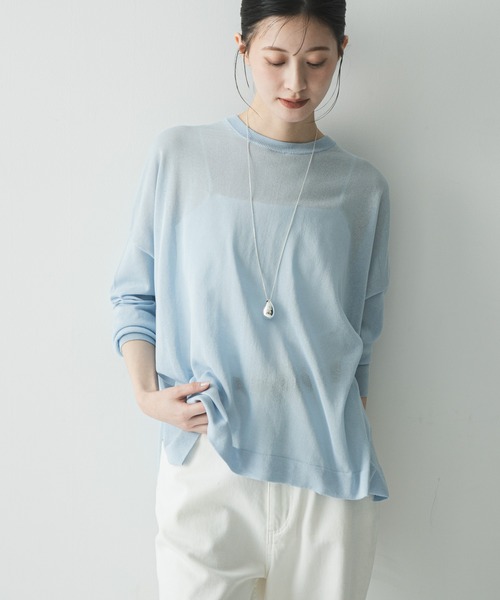 さらりとした肌触りとゆったりしたシルエットで、夏の紫外線・冷房対策をスマートに叶えるUVカット加工ニット。 ハイゲージ仕立ての繊細な編み地が、ボリュームを抑えつつ上品な印象を演出。 体のラインを拾いすぎないルーズなサイズ感に、前後差のある着丈とサイドスリットを施すことで、どんなボトムスともバランス良く決まる一着に仕上げました。 しっかりとしたUVカット機能で日差しをガードするのはもちろん、薄手で軽いため、バッグに忍ばせて冷房対策として持ち歩くのにも最適です。 カットソーよりもきちんと感があり、ブラウスよりも柔らかなニュアンスなので、オンオフ問わず夏のワードローブの主役として活躍します。 POINT ・日差しから肌を守るUVカット機能付きで、手軽に紫外線対策が可能 ・薄手で肌離れの良いハイゲージ素材。シワになりにくく持ち運びにも便利 ・体型カバーを叶えるワイドシルエットながら、着膨れしない計算された落ち感 【2026 Spring/Summer】【26SS】 総重量 : 約195g ※商品画像は、光の当たり具合やパソコンなどの閲覧環境により、実際の色味と異なって見える場合がございます。予めご了承ください。 ※商品の色味の目安は、商品単体の画像をご参照ください。 ▼お気に入り登録のおすすめ▼ お気に入り登録商品は、マイページにて現在の価格情報や在庫状況の確認が可能です。 お買い物リストの管理に是非ご利用ください。