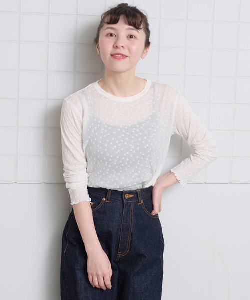 タートルネックでも人気だったすけすけドットの生地でであたらしい形をつくりました。 襟ぐりをクルーネックにしたことで、春から夏にかけて、 また夏場のエアコン下の寒さ対策にも重宝してくれます。 コンパクトなサイズ感なのでインナーを透かして着るのもおすすめ。 ほんのりドット柄なので、柄物とも合わせやすい1枚です。 ※アイボリーはサンプルで撮影しております。正しくは詳細画像をご確認ください。 カラー展開:アイボリー、ブラック 【素材の特性、お取り扱いの注意】 ・この製品は、繊細なジャガードの為、斜行性があります。 一点一点のサイズ感、風合い等微妙に違いがあります。 また、糸及び編組織の性質上引っかけ引っかかりやすい性質をもっております。着脱時には十分ご注意下さい。 ・大変デリケートな生地の為乱暴に扱いますと、破損する可能性があるので、着用中、着脱時には十分御注意下さい。 ・キュプラは水にぬれると縮みやすく、強度が下がることがあります。 また、摩擦によって表面が毛羽立ちやすいので、お取り扱いには十分ご注意ください。 ・この製品を洗濯する際には多少縮む場合がありますので、形を整えてから日陰で干して下さい。 ・この製品の洗濯は、風合いを保つ為、手洗いでお願いします。 ・こちらの商品は、濃色の場合汗や雨などで濡れた際に摩擦により色落ちし、他の衣料や小物に移染することがありますので、ご注意ください。 ※着用商品はサンプルです。実際の商品と仕様、加工、サイズが若干異なる場合がございます。 ※光の関係で実物の商品の色味とは若干異なる場合がございます。 実際に近い色味は詳細画像をご参照下さい。 ※取り扱いの注意については取り扱い表示をよくご確認の上、着用をお願いいたします。 l'atelier du savon(アトリエドゥサボン) CONCEPT 1つ1つにかけられた手のぬくもり 日々の生活に、少しのデザインを加えた大人の日常着 あそび心とあたたかみ