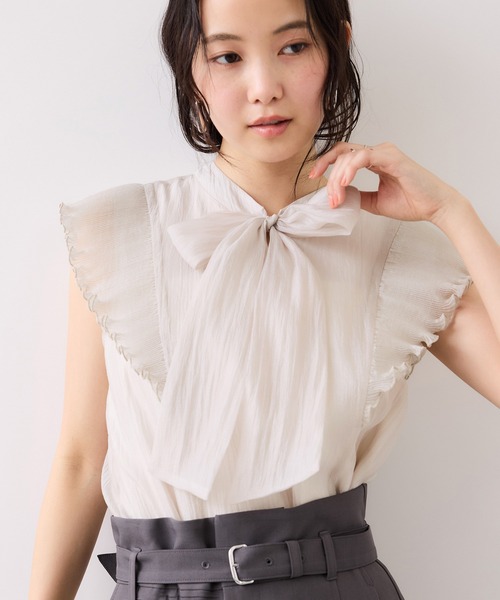 【2026 Spring/Summer】【26SS】 フリルが描く、理想の華奢見えシルエット。好印象を約束する褒められブラウス <POINT> ・前後2WAY仕様 ・ふんわりと軽やかで艶のある素材感 ・ボウタイが華やかで夏の主役級ブラウス ・肩に載るプリーツデザインが女性らしい印象に ・お手入れの簡単なマシンウォッシャブル素材 【デザイン・シルエット】 ボウタイとプリーツデザインが目を惹くブラウス。軽やかで艶のある素材感で華やかな印象に。前後2WAYなのでシーンごとに表情を変えてご着用いただくことができます。気になる肩をさりげなく隠してくれるのも嬉しいポイント。コンパクト目なシルエットでイン/アウト両方のスタイルが叶います。身頃にのみ裏地付きでインナーが透けにくいプルオーバータイプのブラウスです。 【素材】 軽やかで表面感のあるシアー素材。カーディガンなど羽織っても響きづらいです。洗濯機で洗えます。 【カラー】 ベージュ、ライトグリーン、ピンクの3色展開。 【おすすめのスタイリング】 デニムでカジュアルにも、キレイ目パンツで通勤にも◎甘すぎず、スカートもパンツも幅広いテイストのスタイリングに合うボトムを選ばないブラウスです。 ----------------------------- 裏地:あり(見頃のみ) 光沢感:あり 透け感:ややあり 伸縮性:なし ボタン:なし 生地の厚さ:やや薄手 季節:春、夏、秋 ----------------------------- 【モデル着用サイズ】 身長:160cm 着用サイズ:F ※画像の商品はサンプルです。実際の商品と仕様、加工、サイズが若干異なる場合がございます。 ※画像によっては実際の色味と異なる場合があります。正しい色味は生地アップ画像をご確認ください。