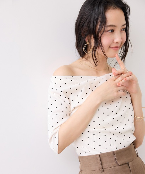 【2026 Spring/Summer】【26SS】 <POINT> ・着心地よい素材を厳選し、軽やかさと肌馴染みの良さを両立 ・胸元のドレープデザインが上品見えを叶え、お顔周りを華やかで知的な印象に ・デイリーからオフィスまで、シーンを選ばず活躍するON/OFF問わないデザイン 【デザイン・シルエット】 胸周りにタックをいれ、流れるドレープデザインは、身に纏うだけで立体的な美しさを生み出し、洗練された上品な佇まいを演出。リブ素材を使用しているので、着心地の良さとスッキリ感もあります。トップスはボトムアウトでサッと着こなしでも、裾にメタルパーツのポイントがありおすすめです。 【素材】 テンションのあるリブのカットソー素材。 【カラー】 使いやすい白とネイビーに加え、白に黒ドット、柔らかいピンクの4色展開。 【おすすめのスタイリング】 ジャケットのインナーとしてクリーンに着こなすのはもちろん、デニムと合わせてカジュアルダウンするのもおすすめです。ON/OFFを問わず、日常のあらゆる場面をクラスアップさせてくれる実力派の一着です。 ----------------------------- 裏地:なし 光沢感:なし 透け感:ややあり 伸縮性:あり ボタン:なし 生地の厚さ:やや薄手 季節:春、夏、秋 ----------------------------- 【モデル着用サイズ】 身長:160cm 着用サイズ:F ※画像の商品はサンプルです。実際の商品と仕様、加工、サイズが若干異なる場合がございます。 ※画像によっては実際の色味と異なる場合があります。正しい色味は生地アップ画像をご確認ください。