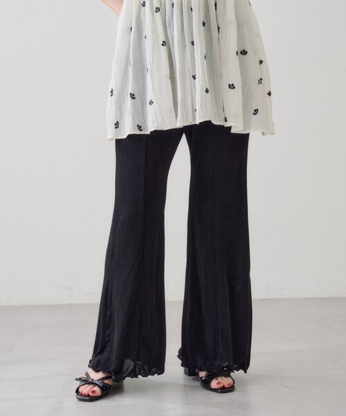 履くだけで−5kg見えのフレアパンツ ※サイズSとMの着丈の差は5cmです。(詳しくはサイズ詳細をご覧ください) ■デザイン 落ち感のある美脚見えのフレアパンツです。 太もも周りはタイトなシルエットですが、膝から下にかけての綺麗なフレアシルエットが足を長く細く見せてくれます。 ■生地感 伸縮性があり、ウエストはゴムなので着脱が楽◎。 楽をしてオシャレを楽しみたい時に選びたくなる着心地です。 *********************** 洗濯方法:手洗い可能 裏地:あり 透け感:ややあり 伸縮性:ややあり 光沢感:なし 生地の厚さ:なし *********************** ■スタイリング オーバーサイズTシャツやシャツ、トレンドのチュニック合わせなどで、着痩せが叶えられます。 上半身にボリュームのあるトップスを着た時に合わせると、すっきりとした印象に。 ▼おすすめスタイリングアイテム インド綿ティアードチュニック フラワーステッチキャミチュニック レースアップアソートジャケット 【お取り扱いの注意】 ※着用時、洗濯時は必ず取り扱い表示・タグをご確認の上、お取り扱いください。 ※サイズ採寸は各モールによって異なり、多少の誤差が生じる可能性がありますのでご了承ください。 ※撮影画像はサンプル品を使用しているため、実際の商品とカラー、仕様、加工、サイズが若干異なる場合がございます。 使用しているパソコンのモニター設定や、携帯電話のメーカー・機種により実際のカラーと異なって見える場合がございます。予めご了承ください。 ▼商品のお気に入り登録 ハートマークをクリックし、お好きなカラーを選んでお気に入りに登録 完売カラーの再入荷通知や、ラスト1点の通知、セールの通知も受け取ることができます。 ▼ブランドのお気に入り登録 新商品や再入荷等、いち早くブランドのお得な情報を受け取ることができます。 <返品・キャンセルについて> ・着用・洗濯後の返品・ご交換は致しかねます。 ・商品到着後、着用前に商品を確認して頂きますようお願い致します。