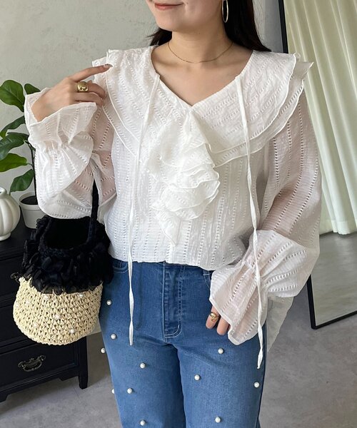 主役級の華やかさ。シアーストライプVネックフリルブラウス ●顔周りを華やかに彩る、たっぷりとあしらったフリルデザインが魅力 ●繊細なシアーストライプ生地が、上品な肌見せと軽やかな印象を演出 ●すっきりとしたVネックと華奢なリボンが、デコルテを美しく見せてくれます♩ ●デニム合わせでカジュアルにも、スカート合わせでフェミニンにも着回せる一枚 フリルブラウス/シアーブラウス/大人可愛い -------------------------------------------------------------- 生地の厚さ:薄め 伸縮性:袖口のみあり 透け感:あり 裏地:なし ポケット:なし 洗濯方法:ご自宅での洗濯可能 -------------------------------------------------------------- ※商品画像はサンプルにて撮影をしておりますので、 実際の商品とは色味や仕様・サイズ等が異なる場合がございますので あらかじめご了承ください。 ※商品のお取り扱いに関しましては、商品に付属の アテンションカード、洗濯ネームをご覧ください。 ※撮影場所やお使いのモニター環境により若干お色味が 異なる場合がございます。 特にロケの撮影では明るく見える傾向にございます。 ※サイト上ではフリーサイズの表記ですが、商品タグには Mサイズと表記されている場合がございます。 その場合、ワンサイズでのご用意となりますのでサイズミス などではございません。詳しいサイズはサイズスペックを ご確認いただきますようお願い致します。 ※サイト上でのカラー名とお届けした商品に記載されている カラー名が異なる場合がございますので予めご了承ください。 <返品・キャンセルについて> ・着用・洗濯後の返品は致しかねます。 ・商品到着後、着用前に商品を確認して頂きますようお願い致します