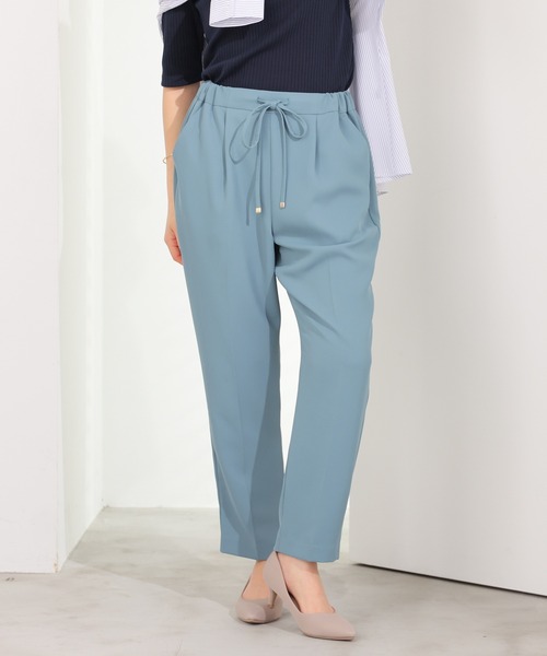 涼しさまでも美しく『美冷』パンツ 【デザイン】 センタープレス入りのきれいなシルエットで、きちんと感もスタイルアップも叶えるデザイン。 ウエストはゴムと紐入りで微調節も可能。 紐先のゴールドパーツがさりげないアクセント。 【素材・機能】 環境に優しい再生ポリエステルを使用した滑らか素材。 ひんやり快適な『接触冷感』と、洗濯後もシワになりにくい『イージーケア』の機能が付いた、触れるたび涼しく、着るだけで美しい『美冷』アイテム。 便利な両サイドポケット付き。 【スタイル】 ジャケットやきれいめブラウスと合わせた通勤スタイルにも、シンプルなTシャツと合せた大人カジュアルにも好相性。 幅広い着回しに活躍。 ※ウエスト部分ゴム ※後ポケットみせかけ 品番:573-73-1109