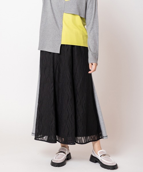 Spring Summer collection ウェアラブルなスウェット素材とレースをドッキングしたスカート。 カジュアルとフェミニンを両立させ、MIXテイストを楽しんで。 =========================== 透け感: なし 伸縮性: あり/レース地: なし 光沢感: なし 裏地: なし/レース地: あり 素材について: カジュアルな風合いの中肉の裏毛 =========================== 【素材】 レースナイロン41%,コットン40%,レーヨン16%,再生繊維(セルロース)3% 別地/ポリエステル100%,編地コットン100%, リブ/コットン98%,ポリウレタン2% 【仕様】 ウエストゴム 【洗濯表示】 洗濯機可 ■商品のお気に入り登録 クーポンやタイムセール、再入荷通知やラスト1点など お得な情報を受け取ることができます。 ご登録をお忘れなく◎