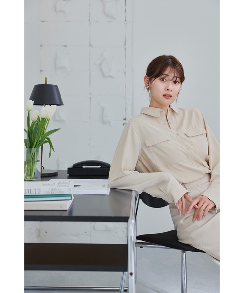 上品な光沢を湛えた素材が、凛とした知性と柔らかな女性らしさを引き立てるシャツ。 控えめな光沢とシルキーな質感が魅力のツイル素材を使用し、肌触りの良さと高級感を兼ね備えました。 とろみのある生地はシワになりにくく、長時間の着用でも清潔感をキープしてくれます。 両胸のフラップポケットが程よいカジュアルさを添え、小ぶりの襟と華奢な前立てが繊細で洗練された印象を演出。 落ち感の美しいファブリックが肩から自然に馴染み、身体のラインをなめらかに整えます。 裾にはサイドスリットを施し、動きに軽やかさをプラス。 タブとボタンを留めることでカシュクールブラウスとしても着用できる2way仕様で、ウエストラインを引き立てたフェミニンなスタイルもお楽しみいただけます。 一見ミニマルでありながら、計算されたパターンワークがシルエットに奥行きをもたらす一着。 オフィスからディナーシーンまで、知的な華やかさを纏えるタイムレスなシャツです。 Model:164cm (beige / off white / sax-Mサイズ) Shoes:スタイリスト私物 ■カラー:beige / off white / sax ※商品の色味は商品単体画像をご参照ください。できるだけ実物に近いカラーを再現するよう注意しておりますが、お客様のモニター環境等により実際の商品と異なって見える場合がございます。 また、同じカラー名でも商品により色が異なりますので、あらかじめご了承ください。 ■素材:ポリエステル 100% ■原産国:MADE IN CHINA ■お手入れ方法:洗濯機による洗濯またはドライクリーニング ※商品の使用前に、タグ等に記載されている「取り扱い上の注意書き」、「洗濯表示」を必ずご確認ください。