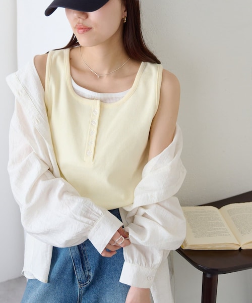 一枚で重ね着スタイルが完成する、レイヤード風タンクトップ・首元はヘンリーネックデザインで、顔周りにすっきりとしたアクセントをプラスします・一枚で着用するのはもちろん、シャツやジャケットのインナーとしても大活躍!・身体のラインを拾いすぎない快適な着心地・デコルテラインを美しく見せる、絶妙なカッティングが女性らしさを演出***********************洗濯方法:手洗い可能裏地:なし透け感:なし伸縮性:あり光沢感:なし生地の厚さ:普通***********************【お取り扱いの注意】※着用時、洗濯時は必ず取り扱い表示・タグをご確認の上、お取り扱いください。・手洗い:30℃まで可能・洗濯ネットを使用してください。・洗濯の際は、他の物と分けて洗ってください。・洗濯により若干の縮みが生じる場合があります。・色落ち、色移りすることがありますので、浸け置き洗いや、濡れた状態での放置はお避けください。・漂白:不可・タンブル乾燥:不可・アイロン:不可・ドライクリーニング:可能・ウエットクリーニング:可能・デリケートなレース素材を使用しております。表面の粗い物に擦ったりバックやベルト、先の鋭い物に引っ掛けますとささくれや糸が浮き易く、切れる事もあります。お取り扱いには十分にご注意ください。【カラー表記について】システム上の都合により、一部カラー名がサイト表記と異なる場合がございます。【入荷時期について】入荷日ごとに販売数量が決まっているため、オンラインでは完売後に次期納期の数量にて予約販売を行っております。店舗入荷時期と予約商品のお届け時期が異なる場合がございますので、予めご了承ください。※追加入荷のある商品もございますので、詳しい店舗入荷時期に関しましてはお近くの店舗へお問い合わせください。※店舗の在庫状況に関しましては、こちらのページに記載されている「店舗在庫」から確認にしていただけます。「在庫あり」の表記でも、お取り置き分などでお客様に販売できない場合がございます。※予約商品でも、店舗では追加がない場合もございます。ご了承ください。※初回予約商品でも配送処理が発生するため、店舗より遅れてのお届けとなる場合がございます。