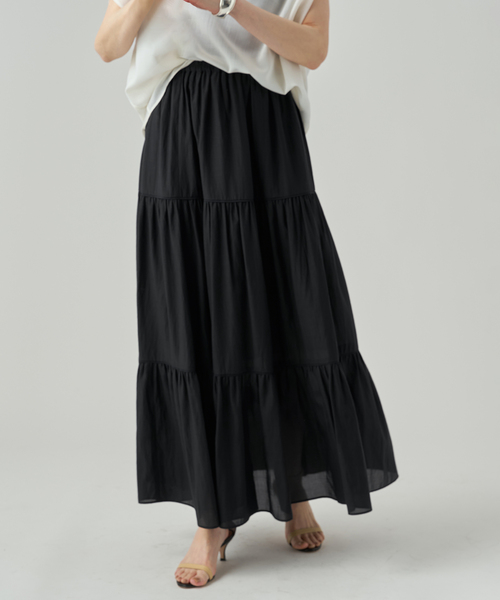 【2026SS】 VERMEIL par iena 軽やかに揺れるティアードが大人の装いに華やぎをプラス。 ボリュームのあるティアードデザインながら、素材は驚くほど軽やか。 動くたびにふわりと揺れ、暑い季節でも涼しく心地よく過ごせる一枚です。 ペチコート付きで安心して着用できます。 ペチコートを外せば、レギンス合わせやチューブトップとのレイヤードなど着こなしの幅が広がるのも嬉しいポイント。 シンプルなカットソーやニットを合わせるだけでスタイルが見違えるスカート。 チューブワンピとしても着られるので、ワードローブに一着あると季節を問わず幅広いシーンで活躍します。 ********************** 透け感:あり 裏地:なし(ペチコート付き) 伸縮性:なし 光沢感:ややあり 生地の厚さ:やや薄手 ********************** 【お取り扱い等について】 ・取り扱いについては、商品についている品質表示でご確認ください。 ・照明の関係により、実際よりも色味が違って見える場合があります。 またパソコン・スマートフォンなどの環境により、若干製品と画像のカラーが異なる場合もございます。 商品の色味は、商品アップ画像をご参照ください。 ・こちらの商品は、VERMEIL par iena での取り扱いになります。 直接店舗へお問い合わせの際は VERMEIL par iena店舗へお願い致します。 ブラック着用スタッフ身長:162cm 着用サイズ:38 ブラック(スナップ)着用スタッフ身長:157cm 着用サイズ:38 グレー着用スタッフ身長:159cm 着用サイズ:38 詳細着用スタッフ身長:163cm 着用サイズ:38 本体:手洗い可能, ペチコート:手洗い可能
