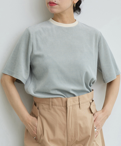 【2026SS】 IENA LA BOUCLE ニュアンスカラーが魅力のカジュアルなベロアボーダー素材を使用したTシャツ。 ベロア特有の柔らかな光沢感が、カジュアルなボーダー柄にほどよい上品さをプラスします。 デザインはすっきりとしたセットインスリーブのTシャツ型で、デイリーに取り入れやすいシルエットに。 襟元の配色がさりげないアクセントとなり、シンプルなスタイリングにも表情を加えてくれます。 カジュアルなアイテムながら、ベロアのツヤ感でレディーライクな着こなしにも活躍。 パンツスタイルはもちろん、スカートと合わせたミックススタイルにもおすすめの一枚です。 ※シリーズもございます。 ベロアボーダータンクトップ(品番 26070914146020 ) ********************** 透け感:なし 裏地:なし 伸縮性:あり 光沢感:あり 生地の厚さ:普通 ********************** ※取り扱いについては、商品についている品質表示でご確認ください。 ※こちらの商品は、IENA LA BOUCLE(NEWoMan新宿店)でのお取扱いとなります。 直接店舗へお問い合わせの際は、上記店舗へお願い致します。 ※照明の関係により、実際よりも色味が違って見える場合があります。 またパソコン・スマートフォンなどの環境により、若干製品と画像のカラーが異なる場合もございます。 ※商品の色味は、商品アップ画像をご参照ください。 着用スタッフ身長:156cm 着用サイズ:フリー 詳細着用スタッフ身長:162cm 着用サイズ:フリー 本体:手洗い可能