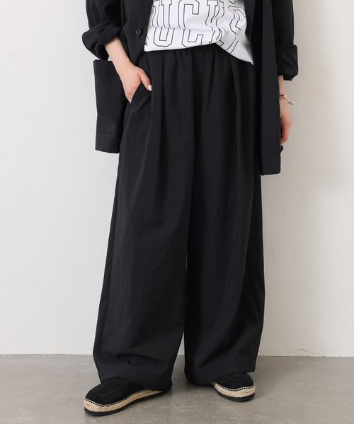 【2026SS】 journal standard luxe ◆2通り着られるトロピカル ヘムイージーパンツ先行予約会 リネンのようなドライタッチな風合いと、軽量かつ清涼感のある、ポリエステル100%のトロピカル素材です。 ウエスト部分はゴムイージー+内テープでサイズ調節が可能、フロントに1タック入りのパンツ。 シューズやコーディネイトに合わせて、裾(内側テープ)を結んでバルーン風シルエットに変化するデザインです。 裏地なしで、ご自宅でお洗濯可能(※手洗いモード推奨)なのも魅力。 ブラック、(チャコール)グレー 全2色。FREEサイズ 〈同シリーズについて〉 《予約》トロピカルジャケット(商品番号:26010440010010) 《予約》トロピカルベスト(商品番号:26011440010010) 《予約》トロピカルヘムイージーパンツ(商品番号:26030440035010)★ ※ジャケットとベスト+パンツのSETUPで着用可能です。 ※取り扱いについては、商品についている品質表示でご確認ください。 ※照明の関係により、実際よりも色味が違って見える場合があります。 またパソコン・スマートフォンなどの環境により、若干製品と画像のカラーが異なる場合もございます。 ※商品の色味は、商品アップ画像をご参照ください。 本体:手洗い可能