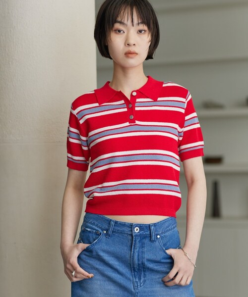 Design Point 襟付きの顔まわりとメタルボタンが効いたポロニット。 程よくボディに沿うコンパクトなシルエットで、袖は短めに仕上げシャープな印象に。 リブで引き締めた裾がバランスを整える一着です。 マルチボーダーがトレンド感のある2色と、バイカラーでほどよくモードに仕上げた2色の4色展開。 Styling Point ハイウエストのボトムと合わせて腰位置を高く見せるとバランス良好。 前だけインでメリハリを作ったり、ライトアウターを羽織ってレイヤードを楽しむのもおすすめ。 Fabric Point しっかりめの編地で程よいボリュームと形状保持を両立。 伸縮性があり動きやすく、肌離れのよい仕上がりで着心地軽やかです。 デイリーに扱いやすくケアもしやすい点が魅力。 モデル身長:168cm 着用サイズ:38(M) ***************************** 気になるアイテムは【お気に入り登録】がおすすめ! 気になるアイテムのページにある「ハートマーク」をクリックして簡単に追加できます。 登録すると、再入荷通知やお値下げ情報をメルマガにてお知らせします。 マイページにてお気に入り一覧もチェックできます。 ***************************** ※照明の関係により、実際よりも色味が違って見える場合があります。また、パソコン・スマートフォンなどの環境により、若干製品と画像のカラーが異なる場合もございます。 店舗へのお問い合わせ商品番号:523-15418 ●製品寸法: 38(M):着丈48cm B82cm 袖丈21cm 肩幅35cm 備考: