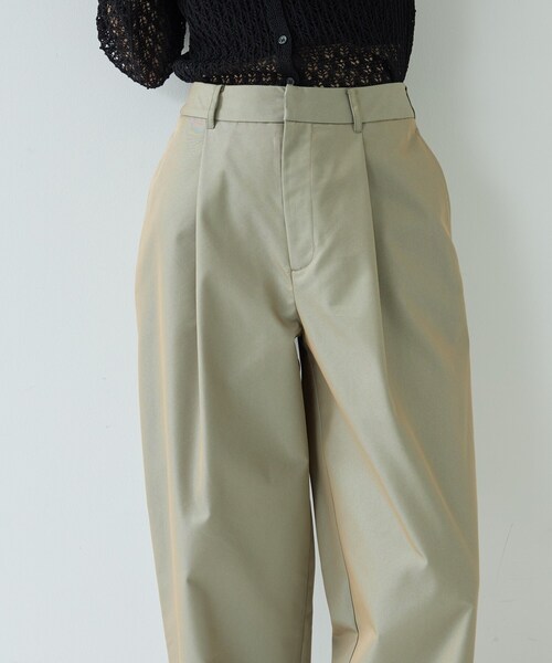 Design Point 深めのフロントタックとセンタープレスで縦長ラインを強調したチノパン。 ハイウエストで腰まわりをすっきり見せつつ、裾に向けて自然に細くなるテーパードが今っぽい抜け感を演出。 ベルトループでアレンジも可能。 Styling Point トップスは前だけインして腰位置を高く見せるとバランス良好。 ショート丈ジャケットやコンパクトなニットと合わせて、上半身を引き締めると洗練された印象に。 フロントタックがあるためトップスのボリュームも受け止める、トップスを選ばない仕様です。 Fabric Point 程よいハリと落ち感を両立する素材でタックの立体感を美しくキープ。 通気性があり動きに馴染むためデイリーに適応。 扱いやすくケアしやすい点も魅力で、長時間の外出にも◎。 モデル身長:168cm 着用サイズ:38(M) ***************************** 気になるアイテムは【お気に入り登録】がおすすめ! 気になるアイテムのページにある「ハートマーク」をクリックして簡単に追加できます。 登録すると、再入荷通知やお値下げ情報をメルマガにてお知らせします。 マイページにてお気に入り一覧もチェックできます。 ***************************** ※照明の関係により、実際よりも色味が違って見える場合があります。また、パソコン・スマートフォンなどの環境により、若干製品と画像のカラーが異なる場合もございます。 店舗へのお問い合わせ商品番号:523-65015 ●製品寸法: 36(S):W65cm H100cm 股下67cm 前股上29cm 渡り幅37cm 裾幅23cm 38(M):W68cm H103cm 股下68cm 前股上29cm 渡り幅38cm 裾幅24cm 40(L):W71cm H106cm 股下70cm 前股上30cm 渡り幅39cm 裾幅25cm 備考: