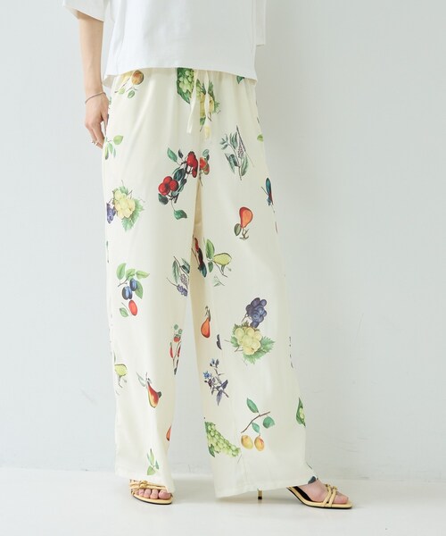 Design Point 落ち感のあるワイドシルエットにウエストゴムとドローストリングを配したイージーパンツ。 両サイドポケットとセンタープレス風の縦ラインで脚長を演出。 アートワークのフルーツモチーフが着こなしの主役になる一着。 Styling Point トップスはタックインでウエスト位置を強調するとバランス良好。 シアーシャツやコンパクトニットと重ねるとリズムが生まれ、アクセサリーで首元や手元にアクセントを効かせると都会的な表情に。 Fabric Point サテンタッチの滑らかな素材で光沢と落ち感が美しく、動くたびに自然な表情が出る。 薄手でありながら透けを抑える設計で単体使いしやすく、家庭でのケアがしやすいイージーケア性も嬉しい。 モデル身長:168cm 着用サイズ:38(M) ***************************** 気になるアイテムは【お気に入り登録】がおすすめ! 気になるアイテムのページにある「ハートマーク」をクリックして簡単に追加できます。 登録すると、再入荷通知やお値下げ情報をメルマガにてお知らせします。 マイページにてお気に入り一覧もチェックできます。 ***************************** ※照明の関係により、実際よりも色味が違って見える場合があります。また、パソコン・スマートフォンなどの環境により、若干製品と画像のカラーが異なる場合もございます。 店舗へのお問い合わせ商品番号:523-65033 ●製品寸法: 38(M):W64~104cm H106cm 股下69cm 前股上33cm 渡り幅33cm 裾幅27cm 備考: