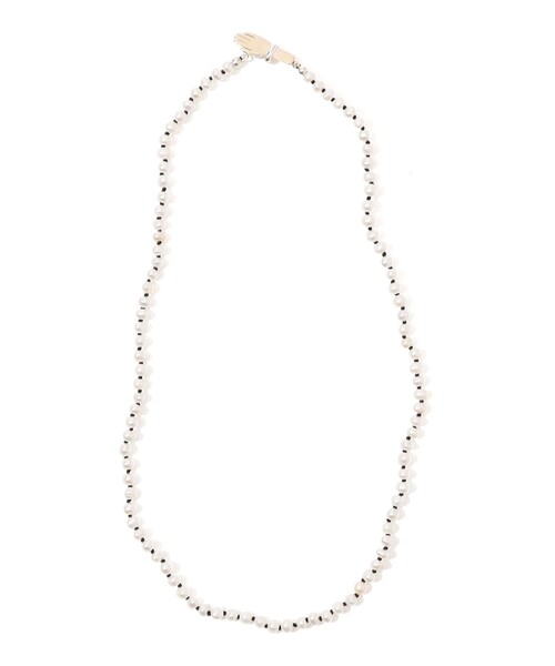 小さなパールとパールの間にノットを挟むだけでカジュアルにお使いいただきやすいネックレス。 クラスプが10金のハンドモチーフで大人な遊び心が◎。 ハンド中央でバングルを付けるように留めるデザインがポイントです。 〈PALA(パラ)〉 2012年にデザイナー木村朱里が立ち上げたジュエリーブランド。 ニューヨークで学んだ経験を活かして日常の身近なものを違った角度から見たとき、新たな発見から得られるインスピレーションを元にジュエリーを生み出します。 世代を超えてもモダンでタイムレスなものとなるように。 デザイナー自身が制作に携わることにより、クラフトマン目線でのクオリティーを大切にしています。 ※商品の色味は、商品単体の画像をご確認ください 2023SS商品 店舗にお問い合わせの際は、下記の商品番号をお申し付けください。 商品番号:31-01-32-01015 ※こちらは天然素材を使用しており、個体差がございます。