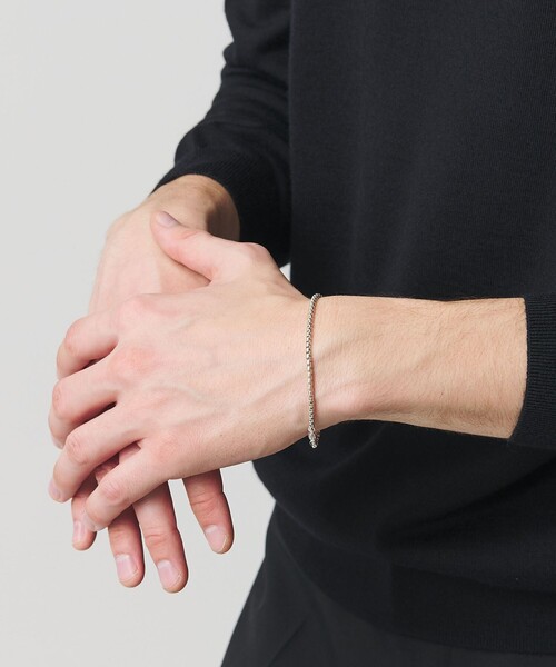 やわらかな連なりが手元に添える、優美な存在感 ■デザイン 繊細なキューブチェーンで構成されたシルバーブレスレット。 甲丸にカットされたやわらかなパーツの連なりが、手元でやさしく、それでいて確かな存在感を放ちます。 留め具には、ブランド名をモチーフとした点対称のオリジナルデザインを採用。 単品使いはもちろん、他のアクセサリーとの重ね付けもお楽しみいただける逸品です。 ■素材 上品な輝きを放つ、シルバー925を使用。 <eoa(イーオーエー)> <eoa>は、その人の人生に寄り添いながら、そこにさりげない彩りを与えるアクセサリーを提案します。 永遠の芸術品「Eternal Object of Art」と呼べるような、時代を越えて愛される普遍的でシンプルなデザイン。 すべてのアイテムを、伝統技術が息づく宝飾職人の街、山梨県甲府からお届け。 【注意事項】 ※商品に「取り扱い上の注意書き」、「洗濯表示」がございます場合は、使用前に必ずご確認ください。 ※商品画像は、光の当たり具合やパソコンなどの閲覧環境により、実際の色味と異なって見える場合がございます。あらかじめご了承ください。 ※商品の色味の目安は、商品単体の画像をご参照ください。 ※画像の商品はサンプルです。 店舗へお問い合わせの際は、全国のBEAUTY&YOUTH各店舗まで下記の品名/品番をお申し付けください。 品名:eoa CUBE BRACE 品番:14335000008