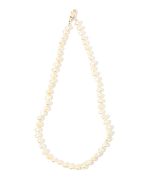 〈PALA〉で人気のハンドモチーフの留め具が印象的な、パールネックレス。 すべてのパールの間に結び目を施したデザインが、ネックレスに軽やかな動きと立体感を与えています。 パールの間からさりげなく覗くカラーが、スタイリングに遊び心とアクセントをプラス。 一点一点異なる表情を持つパールが、ナチュラルな輝きで首元を彩ります。 〈PALA(パラ)〉 2012年から独学で彫金を学び、デザイナー木村朱里が立ち上げたジュエリーブランド。 日常の身近なものから得る新しい視点や発見をインスピレーション源に、ジュエリーを展開。 モダンでタイムレスなデザイン、クラフトマン目線のクオリティーを大切に制作されている。 ※商品の色味は、商品単体または素材アップ画像をご確認ください 2025AW商品 店舗にお問い合わせの際は、下記の商品番号をお申し付けください。 商品番号:31-01-55-01092
