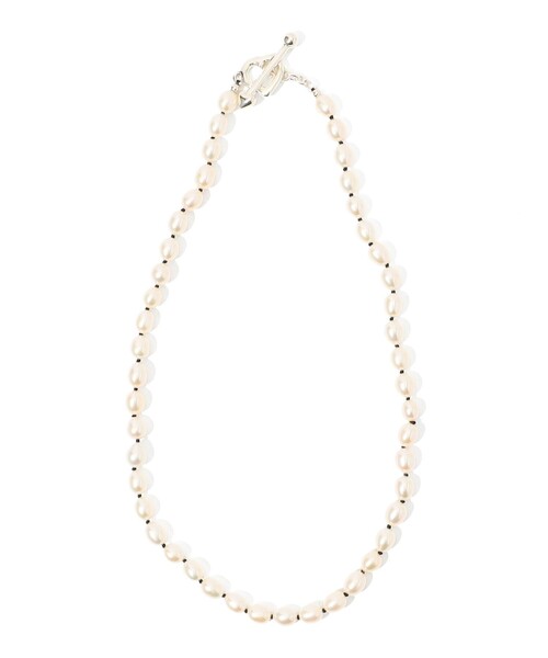 連なる淡水パールが美しいネックレス。 柔らかな光沢が首元を上品に彩り、身につけるだけで華やかな印象を演出します。 パールの間に結び目を配したオールノットデザインが、軽やかな動きをプラス。 シンプルなスタイルのアクセントにはもちろん、ロングネックレスとのレイヤードもおすすめです。 パールの間から覗くブラックカラーのアクセントが、さりげなく個性を添える一本です。 ※素材 SLV925 淡水パール 〈PALA(パラ)〉 2012年から独学で彫金を学び、デザイナー木村朱里が立ち上げたジュエリーブランド。 日常の身近なものから得る新しい視点や発見をインスピレーション源に、ジュエリーを展開。 モダンでタイムレスなデザイン、クラフトマン目線のクオリティーを大切に制作されている。 ※商品の色味は、商品単体または素材アップ画像をご確認ください 2026SS商品 店舗にお問い合わせの際は、下記の商品番号をお申し付けください。 商品番号:31-01-62-01071