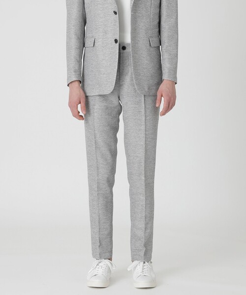 【メランジカラーが特徴のカラミ織り素材トラウザーズ】 メランジ調カラーのカラミ織り素材トラウザーズ。シャープな印象を持たせる細身のシルエットながらも、ウエスト部分にはゴムシャーリングを施し快適な履き心地。ビジネスからカジュアルまで両方の用途に使用できるデザインです。 表地には、程良いメランジ感が特徴のカラミ織り素材を使用しています。先染めの糸を用いて深みのあるメランジカラーに仕上げ、上品で高級感あるカラミ素材に仕上げました。カラミ織り素材特有の通気性の高さと軽さが最大の特徴で、肌離れも良い為、暑い時期のストレスを軽減してくれる1着です。 同素材のジャケット:51E14724