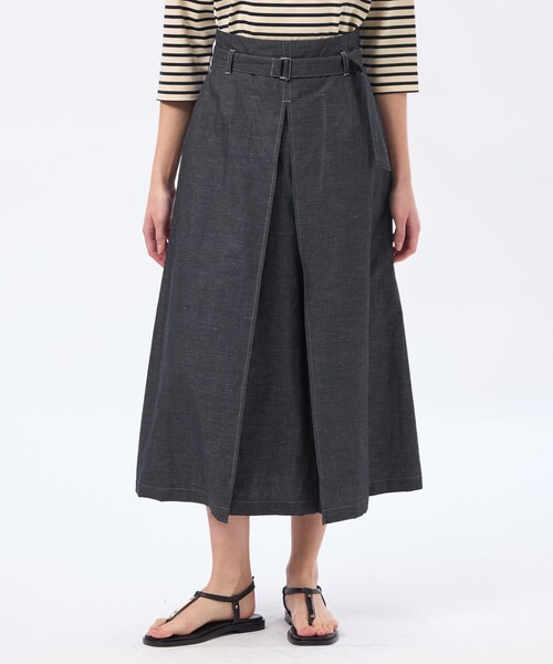 デニム調のコットンリネン素材を使用したベルト付きスカート。フロントの大きなインパーテッドタックがデザインポイントです。 カジュアル素材でありながら、バックル付きベルトと合わせることで程よくキレイ目な印象に格上げします。 足さばきの良いレングスはオフィスカジュアルにもぴったりなスカートです。 【素材】 綿麻の糸を使用したハケ目織素材です。ハケ目(刷毛目)とは、白い糸と染糸を交互に織り上げることで奥行のある色の表現が可能です。 麻ならではの自然なネップと細かいボーダー調の柄が生地の表情を豊かにしています。 ドライタッチな素材ですが、洗いの加工をかけることにより柔らかく膨らみを持たせた風合いが特徴です。 おすすめ着用期間:春/夏/秋 ※34サイズはオンラインストア、ルミネ新宿店、柏高島屋ステーションモール店、ジェイアール名古屋タカシマヤ店、山形屋店、博多阪急、阪神梅田本店のみでのお取扱いになります。 ※この商品はサンプルでの撮影を行っています。 実際の商品とイメージ、仕様が異なる場合がございます。