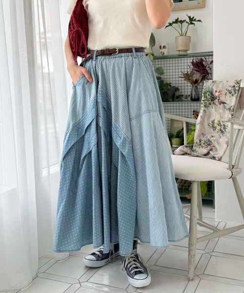 切替部分を折り紙のように畳んだ、立体的なシルエットが魅力のフレアスカート。 トレンドのドット柄をデニムで表現し、DOUBLE NAMEらしいカジュアルな一枚に仕上げました。 個性派さんにはヒッコリー生地×ドット生地の“柄×柄”デザインがおすすめ◎ ウエストは総ゴム+内側紐付きで、サイズ調整もしやすく快適な履き心地です。 ※撮影環境やモニター環境により、実際の色味と多少異なって見える場合がございます。