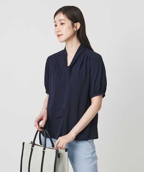 フロントのボウタイが上品なアクセントを添える、フェミニンな印象のブラウス ■デザイン タックを施したゆとりのあるシルエットで、身体のラインを拾いにくく、着心地も快適。 袖口には程よいギャザーをあしらい、さりげない女性らしさをプラス。 オン・オフ問わず幅広いシーンで活躍する、きれいめスタイルにぴったりの1枚です。 ■素材 経緯ともにフルダル糸を使用したジョーゼット素材。 フルダル糸によるマットな質感とジョーゼット組織による高級感が特徴です。 ■コーディネート ジャケットのインナーとして合わせれば、オフィスやフォーマルなシーンにも好相性。 1枚で着る際は、テーパードパンツやタイトスカートを合わせて、女性らしい上品なスタイルに。 デニムやワイドパンツでカジュアルダウンすれば、リラックス感のある休日のお出かけにも活躍します。 ・その他2カラーはベージュのボディにオフホワイトのボウタイです。 ============================ 裏地:なし 透け感:ややあり 伸縮:なし 光沢感:なし ケア方法:手洗い可 ============================ 【注意事項】 ※商品に「取り扱い上の注意書き」、「洗濯表示」がございます場合は、使用前に必ずご確認ください。 ※商品画像は、光の当たり具合やパソコンなどの閲覧環境により、実際の色味と異なって見える場合がございます。あらかじめご了承ください。 ※商品の色味の目安は、商品単体の画像をご参照ください。 店舗へお問い合わせの際は、全国のUNITED ARROWS各店舗まで下記の品名/品番をお申し付けください。 品名:UBC P GGT BOW/TI 5SL 品番:15166000006