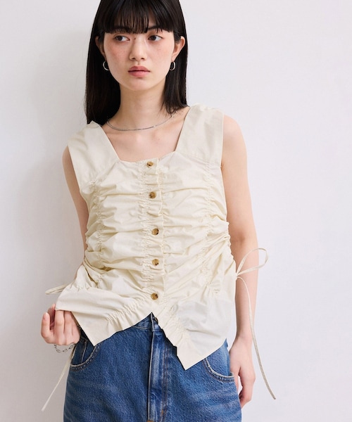 ◇26SS◇ ADAM ET ROPE' FEMME 【Material】 張り感としなやかさを兼ね備えた高密度なポリエステルタフタ素材を使用。 マットな表面感が上品な印象に。 【Design】 くしゅっとした表情が特徴のフロントボタン開きジレトップス。 程よいフィット感でシャーリングを配すことで、シルエットを拾い過ぎず着用できる1着。 ランダムなヘムとボタンの開き具合で抜け感を演出でき、スタイリングにも変化を付けられるアイテム。 【Color】 ブラック、エクリュ、ブラウンの3色展開。 【Styling Point】 キャミソールなどとヘルシーに、ロングワンピースにレイヤードしてトップにアクセントを持ってくるのもおすすめ。 ワイドボトムスとも相性よく、モードなアクセントをプラスしてくれるジレトップス。 --------------- 透け感:エクリュのみややあり 裏地:なし 伸縮性:なし 光沢感:なし 生地の厚さ:薄手 開き方:フロントボタン開き ポケット:なし --------------- ◇モデル情報 身長:163cm size:F ※撮影時の光、お使いのモニター環境によって色の見え方が違う場合がございます。