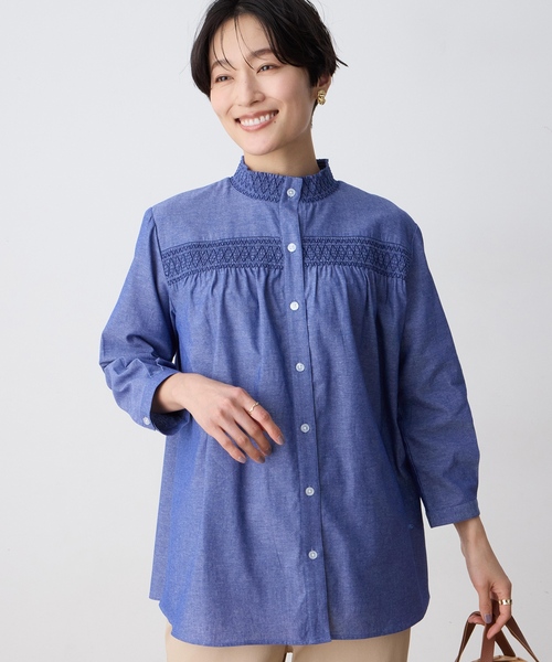 軽やかなシャンブレー素材に繊細な刺しゅうをあしらった上品なブラウス。 ギャザーを効かせたシルエットがやさしく広がり大人カジュアルにもきれいめにも取り入れやすい1枚です。 ワイドパンツでリラックス感を出したり、ロングフレアスカートと合わせてフェミニンコーデもおすすめです。