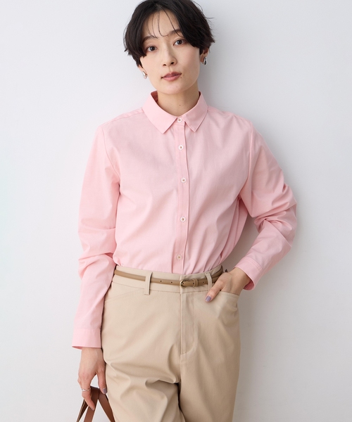 きちんと感のあるベーシックなデザインで着回しやすいコットンブラウス。 しわになりにくい素材でお手入れがしやすく忙しい日常にも頼れる1枚です。 ジャケットのインナーとして通勤スタイルに取り入れたり、カーディガンを羽織ってやわらかくまとめたり一枚着としても季節を問わず活躍します。