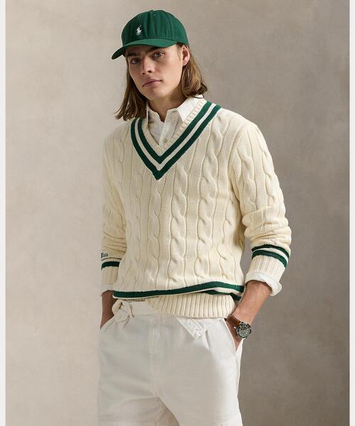 定番のクリーム色で作り出したケーブルニットパターンや、Vネックに加え、伝統的に学校やクラブのカラーを表すストライプ入りのトリムが際立つクリケットセーター。1972年にラルフ・ローレンが発表したバージョンをアップデートし、アイコニックな特徴に、太いゲージのコットン糸とカフスにあしらったゴシック調のロゴ刺繍を組み合わせたアイテム。 ・レギュラーフィット:胸囲に余裕を持たせつつ、モダンなシルエットを維持。 ・ストライプ入りのVネック。 ・長袖、ストライプ入りのリブニットカフス / 右カフスの上にゴシック調の"Polo"のロゴ刺繍。 ・ストライプ入りのリブニットの裾。 ・Ralph Laurenのコットン製品を選ぶことで、環境の保護と修復に努めながら、コットン業界が今後も成長を続けられるように支援するBetter Cotton™ミッションへのRalph Laurenの取り組みをサポートすることになります。 ・本商品は物質収支方式に則って材料を調達しているため、全ての製品にBetter Cotton™が含まれない可能性があります。物質収支方式について詳しくは、bettercotton.org/massbalanceをご覧ください。 ・モデル身長185cm、着用サイズM。 ※商品の色味は、光のあたり具合など諸条件により色感が多少異なって見える場合がございますので予めご了承下さい。 ポロ ラルフ ローレン