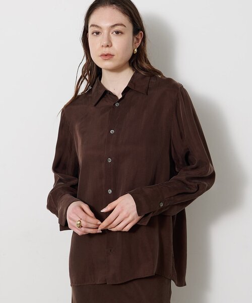 【2026SS】 ラフさの中に上品さ漂う、大人のニュアンスシャツ ■フィブリル加工を施したキュプラ素材を使用したシャツ。 ■しっとりとした落ち感とシルキーな肌触りを表現した素材の風合いが魅力。 ■オンオフ問わずに活躍し、一枚ではもちろん、羽織りとしてもレイヤードにも万能。 ■程よくカジュアルな表情を持ちながらも上品さを感じさせる、大人のスタイリングにぴったりな一枚。 ■同素材のキュプラフィブリルフレアスカート(ブランド品番:WGZ1061401A0001)とのセットアップもおすすめ。 【COLOR】 ベージュ:着こなしのアクセントになる華やかなキャメルベージュ。 カーキ:落ち着いたカラーが大人っぽいくすみカーキ。 ブラウン:上品な印象を与えてくれる大人ブラウン。 【MATERIAL】 フィブリル化させることにより、柔らさとシルキータッチを出したキュプラ100%のツイル素材。 【STAFF COMMENT】 ■身長162cm|普段サイズ S~M|着用サイズ F しっとり落ち感のある生地、1枚での着用時も透けないです。同素材でロングスカートも展開しています。サラリとした生地でストレスフリー◎。 ■身長167cm|普段サイズ M~L|着用サイズ F とろみがあってストンと落ちるシルエットなので、ボディラインの気になる部分も自然にカバーしてくれます。程よいツヤ感が上品な印象です。 ---------------------------------------------------- 洗濯方法:手洗い可 透け感:なし 裏地:なし 伸縮性:なし 光沢感:あり ---------------------------------------------------- 【注意事項】 ・画像の商品はサンプルです。実際の商品と仕様、加工が若干異なる場合があります。 また 、パソコンやスマートフォンのモニター環境などにより、色味が違って見える場合があります。 ・店頭及び屋外での撮影画像は、光の当たり具合で色味が違って見える場合があります。 商品の色味は、スタジオ撮影の画像をご参照ください。 ・入荷状況により、お届け予定が前後する場合があります。 ・お客様への発送が店頭販売より遅れる場合があります。 ・追加生産商品は、一部の店舗、通販で販売中の場合があります。 予めご了承下さい。 【気になるアイテムは、「お気に入り」登録を】 ハートマークをクリックしておくことで、スムーズにお買い物が楽しめます。 ・ラスト一点のお知らせ ・再入荷のお知らせ ・SALEのご案内