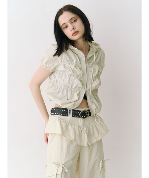 【ポイント】 スポーティな印象のナイロンブルゾンを、身頃のシャーリングやパフスリーブ袖で、 トップスのようにすっきりとしたシルエットに仕上げたこだわりのアイテム。 フードに施したフリルでjouetieらしい甘さをプラス。 取り入れるだけで韓国っぽいトレンドスタイリングが完成します! 【スタイリング】 コンパクトなサイジングなので、トップスとしての着こなしがおすすめ。 ダブルZIP仕様になっているのでロングを合わせる際は裾を少し開けて抜け感を出すとバランスの良いコーディネートに。 ミニボトムを合わせたスポーティ×ガーリーMIXスタイルが今季イチオシ◎ 同素材のペプラムナイロンルーズパンツとのセットアップ着用もおすすめです! ※着用画像はフラッシュの加減で実際の製品と色味等が異なる場合がございますので、生地のズームアップ画像をご確認ください。 ※ご利用の端末画面の設定により実際の商品と色味が異なる場合がございます。 ※正しいサイズはアイテムサイズ表をご確認ください。 ※商品のお取り扱いについては、脇についている洗濯ネーム類をご確認下さい。