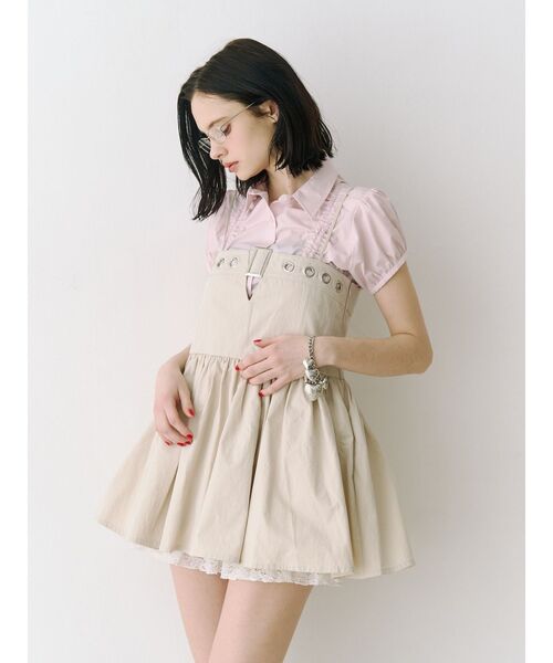 【ポイント】胸元のハトメデザイン×フレアシルエットミニの甘辛バランスがjouetieならではのキャミチュニック。ハリ感のある素材が形状記憶され、メリハリのあるシルエットを作り出してくれます!【スタイリング】コンパクトシャツ×ネクタイのマニッシュなレイヤードがjouetieらしいイチオシスタイル。ショートパンツを合わせてミニワンピース風はもちろん、フレアパンツやルーズシルエットデニム、スウェットパンツを合わせたチュニックとしての着こなしもおすすめです!