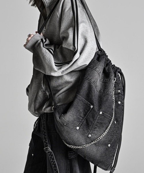 ■アイテム概要 ウォッシュドデニムにチェーンとメタルパーツを組み合わせた、グランジムード漂うデニムナップサック。 ラフに使えるナップサックの気軽さに、無骨なメタルディテールを加えることで、ストリートライクな存在感を演出します。 A4サイズが収まる容量設計で、デイリーユースはもちろん、通学や外出シーンにも対応する実用性の高さも魅力です。 スタイリングのアクセントとして映えるデザインで、シンプルなコーディネートに取り入れるだけでトレンド感をプラス。 持つだけで雰囲気を引き上げる、存在感のあるデニムバッグに仕上げました。 ■素材 ブラックデニムにウォッシュ加工を施し、ヴィンテージライクな風合いを表現。 程よい肉感のデニム素材でデイリーユースにも耐えるタフな仕上がりに。 裏地には滑りの良いポリエステルツイルを使用し、荷物の出し入れをスムーズに設計しています。 ショルダーストラップ(肩紐)は丸みのあるやや太めの丸紐を採用し、肩への負担を軽減しながら耐久性にも配慮。 ■シルエット・デザイン フロントにはデニムパンツを思わせるヨークデザインのシームワークを配置。 ヒップポケット風のパッチポケットとメタルリベットが、デニムらしいディテールを演出します。 取り外し可能な喜平チェーンをアシンメトリーに配置し、ウォレットチェーンとしても使用できる2WAY仕様。 内側には広めのファスナーポケットを備え、収納力と整理のしやすさを兼ね備えています。 キーホルダーやストラップなども気軽に取り付け可能なため、自分好みにカスタムする楽しみもあるナップサックです。 ■attention この製品は染色の特性上、水濡れや摩擦などにより色落ちすることがありますのでご注意ください。 お手入れの際は、かたく絞った布で拭き取った後、風通しの良い日陰で乾燥させてください。 保管の際は高温多湿の場所を避け、風通しの良い場所で保管してください。 ■サイズスペック 高さ:約50cm 幅:約38cm 肩紐長さ:約105cm 肩紐幅:約0.8cm チェーン長さ:約62cm チェーン幅:約1cm ■動画着用モデル model:172cm 着用サイズ:FREE ■ブランドコンセプト 【犬飼 京 プロデュース】 着る人の人生を導く服作り、ありのままの自分を好きになる「ADRER」
