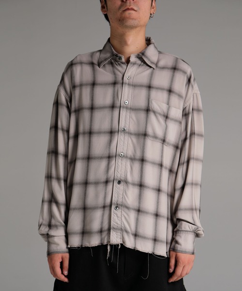 落ち感のある微光沢のレーヨン素材を使用したチェック柄シャツ。脇下・ポケットのチェックはすべて柄合わせを行い、裾は敢えて切りっぱなしに仕立て、身頃は製品染めを施しオリジナルの配色に仕上げたデザイン。左胸にパッチポケットを配置、右裾にはピスネームを挟み込み。ドロップショルダー、身幅にゆとりのあるシルエット。2色3サイズ展開。モデル身長180cm Lサイズ着用