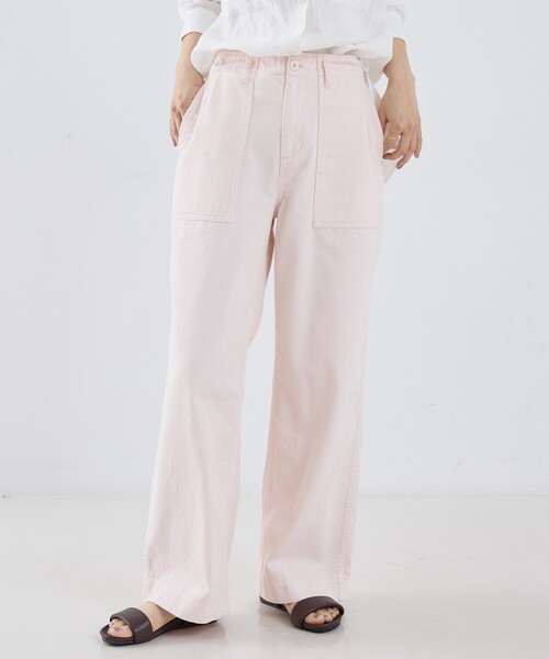 製品染めコットン ベイカーパンツ 《POINT》 コットン100%生地に製品染め(ガーメントダイ)と洗いを施し、こなれた風合いに仕上げたベイカーパンツ。 独特の色ムラやアタリ感が、大人のカジュアルスタイルに奥行きをプラスします。 ヒップ周りはすっきり、太ももから下はゆとりのあるストレートシルエットでスタイルアップも◎ サイドタブと内側の紐でウエスト調整が可能。 淡いピンクはスウェットを合わせたヘルシーに、カーキはシャツを合わせてマニッシュにと、色によって異なる表情を楽しめます。 ロールアップして抜け感のある着こなしもおすすめです。