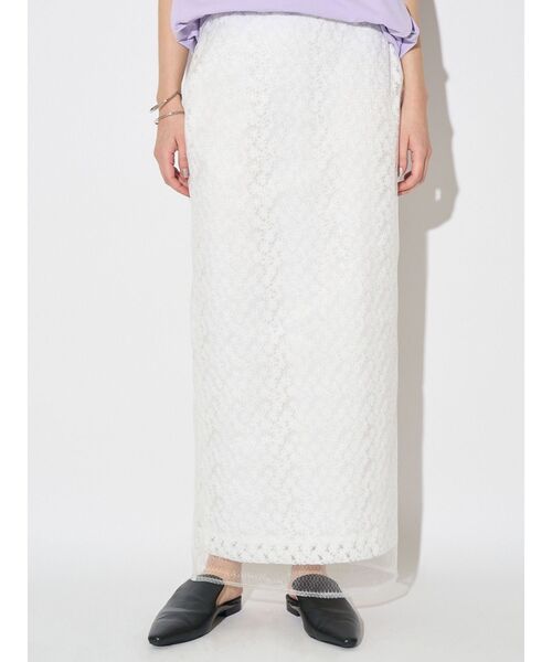 EMBROIDERY I-LINE SK 繊細なチュールに刺繍を施したレーススカート。 密度のある花柄刺繍は幾何柄のような印象なので甘すぎず大人っぽい印象。 刺繍の上からさらにチュールを重ねることで刺繍の主張をおさえ、クリアで奥行きのある表情に。 ウエスト部分は後ろがゴム仕様になっており、裾にはベント入りで足さばきも〇。 コンパクトなアイラインシルエットでボリュームトップスにも相性抜群。 ・・・・・・・・・・・・・・・・・・ 透け感:あり 裏地:あり 伸縮性:ややあり 生地の厚さ:薄い 洗濯:手洗い可 ・・・・・・・・・・・・・・・・・・