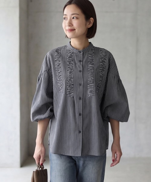 フロント上部をパーツで切り替えた、凝ったデザインが印象的なストライプ柄のシャツブラウス。ストライプとボーダーを組み合わせた立体的な構造で、フリルを使わず甘さを抑えた大人らしい可愛さに仕上がっています。着るだけで雰囲気が出るため、シンプルなボトムスと合わせるだけでスタイルが決まります。 生地は薄手ながらハリのあるシャツ素材で、スッキリとした質感と扱いやすさが魅力。身幅にゆとりを持たせたふんわりシルエットで体のラインを拾わず、自然にカバーできます。バンドカラーの首元や前後差のある丈感、背面のギャザーにより、立体感と抜け感のある着こなしが叶います。 きれいめにもカジュアルにも合わせやすく、パンツとの相性が特に良好。薄手なのでインもしやすく、ベストやニットとのレイヤード、前開きで羽織りとしても活躍します。シワになりにくく手入れが簡単で、日常使いしやすい一枚です。 【その他の仕様】 ◆着用時期:夏以外 ◆サイズ感:ゆったり ◆丈感:ヒップが隠れる程度 ◆シルエット:ストレート ◆首元:バンドカラー ◆肩幅:問わないタイプ ◆アームホール:広め ◆袖幅:広め ◆袖丈:長袖 ◆袖口:細幅カフス+ボタン1個 ◆厚み:薄手 ◆柔らかさ:柔らかさとハリ感が共存 ◆肌触り:サラッとしてスムース ◆着用ジワ:できにくい ◆毛羽立ち:できない ◆伸縮性:なし ◆光沢感:なし ◆透け感:なし ◆スリット:なし ◆着脱:フロントボタン開き ◆ボタン:同色の蝶貝パール系光沢ボタン ◆ポケット:なし ◆手洗い:可能 ◆アイロン:不要 ◆スチーマー:使用OK 【お色について】 ◆ネイビー:彩度が薄めのアッサリとしたネイビー。黒ボトムスと合わせても暗くならずに素敵にキマる明るさがあります。線の色はホワイトです。 ◆ホワイト:一般的な白いシャツのお色。イエロー味などの色味感は無いクリアな発色のホワイトです。線の色はスミクロです。