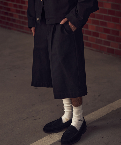 従来のダック生地特有のかさばりやごわつき、重さを軽減したライトオンスダックを採用。 タフさはそのままに、より快適な穿き心地を実現しました。 ワークパンツ由来で太めに設計したウエストバンドは、スナップボタンによる開閉仕様です。 無骨さを残しつつ、着脱のしやすさにも配慮したディテールを採用いたしました。 フロントにはタックを施し、ワタリから裾にかけてワイドに広がるシルエットを構築。 生地の適度なハリ感を活かすことで、立体的で存在感のあるフォルムに仕上げました。 ワイドながらも全体のバランスを整えることで、上品な印象を演出しています。 丈は膝下に設定し、バランスの取りやすいレングスに設計しています。 なお、BLACKカラーのみ「DUCK JACKET」とのセットアップ着用が可能です。 【NAMELESSNESS / ネームレスネス】 24AWよりスタート。デザイナー非公開。 ストリートやモードなど特定のテイスト、ジャンルに囚われず、敢えて余白を残すことで新たなスタイルを提案していく。 ※取り扱いについては、商品についている取扱表示にてご確認下さい。 ※照明の関係により、実際よりも色味が違って見える場合があります。 ※またパソコン・スマートフォンなどの環境により、若干製品と画像のカラーが異なる場合もございます。 ※商品の色味は、商品アップ画像をご参照ください。 本体:手洗い可能
