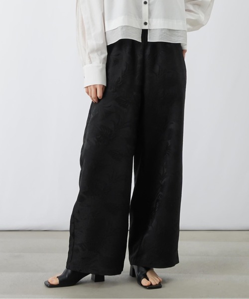 2026 Spring & Summer 【高級感あふれるジャガードパンツ】 ◆Design 光沢と艶感が魅力のボタニカル柄ジャガードパンツ。 シンプルなワイドストレートシルエットで体のラインを拾わずスッキリ見せてくれます。 ウエストは総ゴム仕様で着脱しやすく、程よいサイズ感で穿き心地らくちん♪ シンプルなアイテムと合わせてもコーデが華やぐ上品な印象の一着です。 ◆Fabric ・表面感のあるボタニカル柄のジャガード生地 ・光沢と艶のある生地 ◆color ・オフホワイト、ブラックの2色展開です。 ◆Styling ・パンツと同じカラーのシンプルなトップスを合わせてワントーンコーデに。 ・ロング丈のシャツやワンピースを合わせてこなれ感のあるレイヤードスタイルに。 ・フリルが付いたブラウスやパフスリーブのブラウスを合わせて上品なレディライクコーデに。 -------------------------------- 生地の厚さ:薄手 透け感:オフホワイトややあり 伸縮性:ややあり 光沢感:あり 裏地:なし 洗濯:手洗い可 -------------------------------- 【お買い物をよりお楽しみいただくために】 〇商品のお気に入り登録 完売カラーの再入荷や、完売間近の通知、セールの通知を受けることができます。 〇ブランドのお気に入り登録 新商品や再入荷など、いち早くブランドのお得な情報を受け取ることができます。 【♡をクリック!ご登録お願いします!】