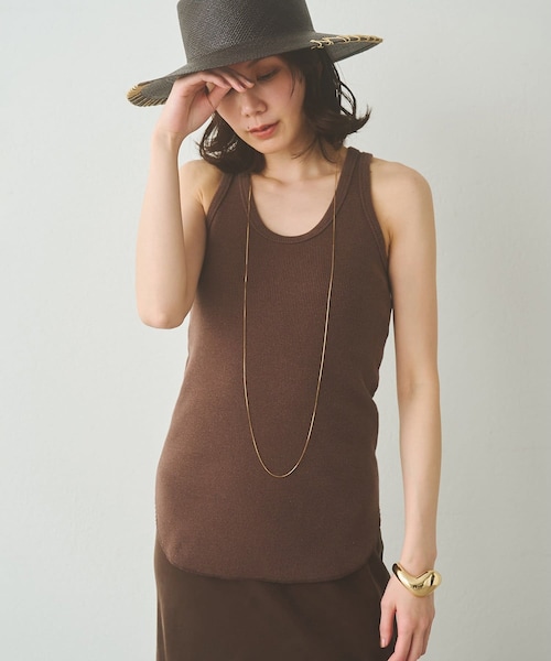【2026SS】一枚でもレイヤードでも使える、大人のリブタンク■コンパクトなシルエットが女性らしいタンクトップ。■柔らかく中肉厚の素材に加工を施し、ヴィンテージ感のある風合いを表現。■一点一点異なる色合いやムラ感も、このアイテムならではの魅力。■タイトなクルーネックのシンプルデザインで、一枚で着てもレイヤードしても楽しめるベーシックアイテム。【COLOR】オフホワイト:クリーンな印象に導くオフホワイト。ベージュ:女性らしく肌馴染みの良いベージュ。カーキ:こなれた印象を与えるナチュラルなカーキ。ブラウン:大人っぽく上品に決まるブラウン。【MATERIAL】加工を施すことでヴィンテージの雰囲気を出した、中肉厚で柔らかく優しい風合いのテレコ素材。※加工を施しているため、色合いや風合いには一点一点個体差がございます。ムラ感も味わいとしてお楽しみください。----------------------------------------------------洗濯方法:水洗い可透け感:なし裏地:なし伸縮性:あり光沢感:なし----------------------------------------------------【注意事項】・画像の商品はサンプルです。実際の商品と仕様、加工が若干異なる場合があります。また 、パソコンやスマートフォンのモニター環境などにより、色味が違って見える場合がございます。・店頭及び屋外での撮影画像は、光の当たり具合で色味が違って見える場合があります。商品の色味は、スタジオ撮影の画像をご参照ください。・入荷状況により、お届け予定が前後する場合があります。・お客様への発送が店頭販売より遅れる場合があります。・追加生産商品は、一部の店舗、通販で販売中の場合があります。予めご了承下さい。