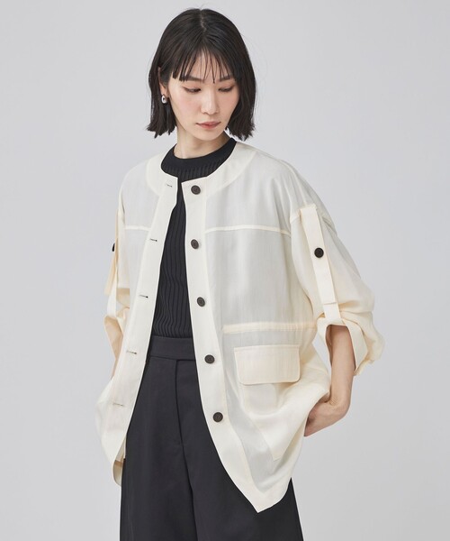 【軽さと機能性を兼ね備えた、長いシーズン活躍するライトジャケット】 ●ワークディテールが光る、大人のシャツジャケット ワークディテールをほどよく散りばめ、大人らしい落ち着きとこなれ感を持ち合わせたライトジャケット。 ウエストの内側にはドローストリングを備え、気分に合わせてシルエットを自在に調整できます。絞ればスタイルアップ、緩めればラフな雰囲気と、着こなしの幅がぐっと広がります。 ●さりげないディテールが上品な抜け感を演出 ロールアップ仕様の袖で、気温に合わせてアレンジ可能です。また、 丸襟デザインが柔らかさと抜け感をプラス。 ワークテイストを取り入れつつ、キレイめに仕上げた絶妙なバランス で、軽羽織として長く活躍します。 ●素材へのこだわりで“軽さ”と“表情”を両立 リヨセル素材に洗い加工を施した、ヴィンテージ感のあるポプリンを使用。 さらにナイロン糸を組み合わせることで ナチュラルなシワ感や 軽い着心地、 こなれた風合い が生まれデイリーにも旅行にも重宝する一枚に。 接触冷感機能付きで、春夏の着用も快適。暑い時期の羽織としても活躍します。 ●こんなシーンにおすすめ 季節の変わり目の軽アウターとして 使いやすいアイテム。 ワンピースにもパンツにも合わせやすい万能デザインです。 同素材のパンツ(N5R01724)とのセットアップもおススメです。 透け感:あり 伸縮性:あり 生地の厚さ:普通 おすすめ着用期間:春、夏、秋 【注意事項】 ※この商品はサンプルでの撮影を行っています。 実際の商品とイメージ、仕様が異なる場合がございます。 ※商品画像は、光の当たり具合やパソコンなどの閲覧環境により、実際の色味と異なって見える場合がございます。あらかじめご了承ください。