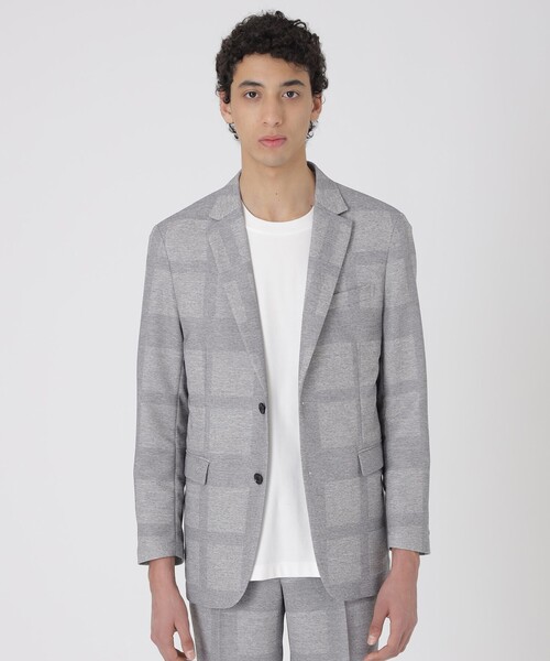 【アイコンチェック柄をプリントしたカラミ織り素材テーラードジャケット】 クレストブリッジチェック柄をプリントしたカラミ織り素材アンコンジャケットです。肩パットや固い芯地を省き、袖裏も使用しないことで、軽さと着心地の良さを追及しました。また、肩回りのパターン設計と仕様を見直すことで、アンコン仕様でありながらも構築的かつドレッシーなシルエットに仕立てています。 表地には、クレストブリッジチェックをさりげなくプリントしたオリジナルカラミ織り素材を使用しています。先染めの糸を用いて深みのあるメランジカラーに仕上げ、プリントを施すことでオリジナル性の高い素材に仕上げました。また横糸にストレッチ糸を加える事で快適な着心地を実現しています。カラミ織り素材特有の通気性の高さと軽さが最大の特徴で、肌離れも良い為、暑い時期のストレスを軽減してくれる1着です。 同素材のトラウザーズ:51R13723