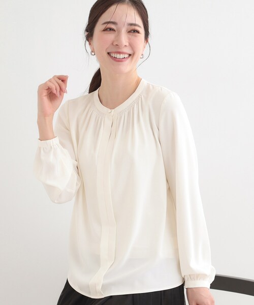 【デザイン】 襟ぐりのきらっと光るメタルボタンがアクセントのブラウス。 ジャケットインで着用した際にポイントになるフロントのタックディテールもポイントです。 無地3色、柄1色の計4色展開です。 【スタイリング】 C62‐45311、C62‐45312のジャケットと、C62‐65311、C62‐65312パンツのインナーとして着用がおすすめです。 セットアップのインナーとして以外でも、きれいめのワンピース、ジャンドレのインナーとして使っていただいたり、 きれいめのスカートと合わせたスタイルもおすすめです。 デニムと合わせたカジュアルダウンスタイルにもマッチします。 【素材】 薄手の落ち感のあるジョーゼット素材。 嬉しい機能付き。 ・マシンウォッシャブル ・UV ・接触冷感 ・イージーケア ・吸水速乾 ※この製品は、太陽光線中の紫外線(UV)を通しにくくします。この効果は永久的ではありません。 ※この製品は、吸水速乾効果のある素材を使用しています。この効果は永久的ではありません。 ※照明の関係により、実際よりも色味が違って見える場合があります。また、パソコン・スマートフォンなどの環境により、若干製品と画像のカラーが異なる場合もございます。 モデル情報:身長166cm B80 W59 H85 着用サイズ:02(M) 店舗へのお問い合わせ商品番号:C62-85311 ●製品寸法: 01(S):着丈59cm B100cm 袖丈57cm 肩幅35cm 02(M):着丈60cm B103cm 袖丈58cm 肩幅36cm 03(L):着丈61cm B106cm 袖丈59cm 肩幅37cm 04(LL):着丈62cm B109cm 袖丈60cm 肩幅38cm 備考: