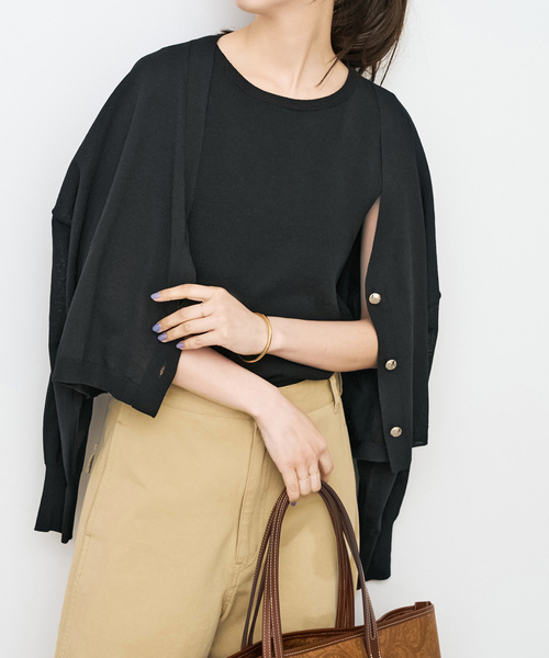 この夏に嬉しい手洗い可能な素材を使用した、2枚セットのアンサンブルニット。 ドライタッチでさらりとした肌離れの良さと、ハイゲージならではの上品な表情が魅力です。 タンクトップと長袖カーディガンの組み合わせは、計算されたバランスでかしこまりすぎず、程よい抜け感のある洗練された印象に。 さらっと重ねるだけで、こなれた大人のスタイリングが完成します。 それぞれ単品でも活躍するデザインで、スタイリングの幅がぐっと広がるのもポイント。 シーンを問わず着回せて、ワードローブをさりげなく格上げしてくれる一着です。 ********************** 透け感:ホワイトのみややあり 裏地:なし 伸縮性:あり 光沢感:なし 生地の厚さ:やや薄い(ノースリーブやや厚い) ********************** 【スタッフ着用コメント】 《スタッフY》 20代後半/身長:163cm/普通/普段サイズ:L/着用サイズ:フリー サイズ感:カーディガンはやや短めの丈感で上下にメリハリがつけられます。タンクトップは首周りにホールド感があり、露出を抑えられます。 素材感:カーディガンは薄手で涼しく着れます。ノースリーブはやや厚めで透けにくく安心です。 着心地:ロングシーズン使いやすそうなアイテム。フィット感があるノースリーブは体のラインを程よくカバーしてくれて安心です。 ********************** ※取り扱いについては、商品についている品質表示でご確認ください。 ※こちらの商品は、Spick & Spanでの取り扱いになります。 直接店舗へお問い合わせの際は Spick & Span店舗へお願い致します。 ※照明の関係により、実際よりも色味が違って見える場合があります。 またパソコン・スマートフォンなどの環境により、若干製品と画像のカラーが異なる場合もございます。 ※商品の色味は、商品アップ画像をご参照ください。 ブラック着用スタッフ:161cm 着用サイズ:フリー カーキ着用スタッフ:160cm 着用サイズ:フリー 詳細着用スタッフ:163cm 着用サイズ:フリー 本体:手洗い可能