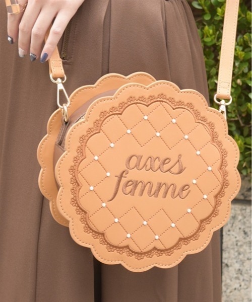 【アイテム説明】 【商品紹介】 やさしく甘い雰囲気をまとった、クッキーモチーフのショルダーバッグです。 【デザイン】 こんがり焼き上げたクッキーのようなキャメルカラーに、繊細なレース風の縁取りとキルティングをプラス。 小さなパールを散りばめて、アイシングをほどこしたような華やかなデザインに仕上げています。 チョコレートを挟んだようなサイドの配色使いにも注目♡ 中央には「axes femme」のロゴをあしらい、フェミニンな世界観をぎゅっと詰め込んだアイテムです。 中を開けると、裏地は爽やかなブルーのチェック柄♪ 前後に内ポケットがついており、奥行きのある仕様です。 ショルダーベルトはお好みの長さに調節が可能です。 【コーディネート】 甘く華やかなアクセサリーを合わせて、スウィートな装いに仕上げて♪ ティータイムモチーフゴムベルト ティータイムER&ピアス ティータイムモチーフリング ティータイムマルチクリップ ティータイムリボンチャーム ▽ axes femme * アクシーズファム 【Concept】 axes femmeのお洋服であなたのライフスタイルに ほんの少しだけ彩る花が咲きますように。 ブランドを通して、彩る花たちが、 人と人、お客様や作り手たちの想いが世界中に繋がっていきますように。 ベル・エポック(フランスの古き良き時代)にパリジェンヌたちが愛したファッションや文化にルーツをおき、 独自のフェミニンスタイルを楽しむブランド ********************** .。.: お気に入り登録のおすすめ :.。. ∇気になるアイテムを登録∇ ハートをクリックしてお気に入りに登録すると 完売カラーの再入荷やラスト1点の通知、セールの通知を受けとることができます。 ∇ブランドを登録∇ 新商品や再入荷、セール通知など、いち早くブランドの情報を受けとることができます。 是非ご利用頂き、お買い物をお楽しみ下さい。 .。.: 商品について :.。. ・サイト上のカラー名と、お届け商品に記載されているカラー名が異なる場合がございます。 ・商品の色味は、撮影場所や光のあたり具合、お客様のお使いのPCのモニター環境などにより色味が違って見える場合がございます。 予めご了承の上ご注文下さい。 .。.: 返品・キャンセルについて :.。. ・着用、洗濯後の返品は致かねます。 ・商品到着後、着用前に商品を確認して頂きますようお願い致します。