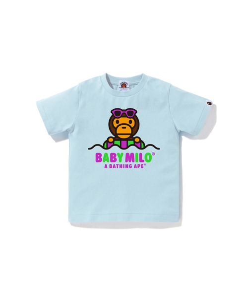 コットン天竺のオリジナルボディを使用したショートスリーブTシャツ。フロントに浮き輪で海に浮かぶBABY MILO®︎モチーフをラバープリント。左袖にピスネーム。レギュラーフィットシルエット。PVC素材のポーチが付属。