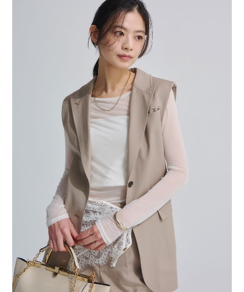 ハンサムな佇まいを纏う、二面性ベスト ■ Design 程よくゆとりを持たせながらもすっきりとしたシルエットで仕上げた、ミニマルなVネックベスト。 身体のラインに沿うパネルラインが女性らしさを引き立て、全面に芯を施すことで立体感のある美しいフォルムと、きちんと感を両立。 顔まわりを華やかに演出するモードなラペルは、甘さを抑えたハンサムな表情が魅力。 随所に施したAMFステッチはデザインアクセントとしてだけでなく、衿の落ち着きや仕立ての良さをさりげなく際立てます。 衿を立てることで、印象を変えたモードなデフォルメーションも楽しめるデザイン。衿裏には合皮素材を用い、シャープですっきりとした印象をプラスしました。 ■ Fabric ウール混ならではのしなやかさとふくらみ感を備えつつ、平織り組織による程よいドレープ性が美しい梳毛素材。 毛羽立ちを抑えたクリアな表情で、きちんと感と軽やかさを両立し、シーズンレスに着用いただける素材。 ■Coordinate 付属の合皮ベルトでウエストマークすればスタイルアップ効果も叶い、表情の異なる2面性のあるスタイリングをお楽しみいただけます。 同素材でお作りしたパンツ(1526220195)とのスタイリングがおすすめです。 =================================== 裏地:あり 透け感:なし 光沢感:なし 伸縮:なし ケア方法:ドライクリーニング ===================================